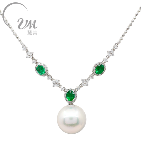 UM Jewelry Collar de oro macizo de 18 quilates con esmeralda de diamante natural y perla de agua dulce-Conjunto de fiesta conmemorativa de boda unisex